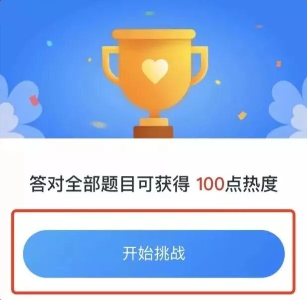 一共有5道题目,答对1题=20点热度,最高可获100点热度,题目类型不仅局限于公益,还有历史、文学等知识点等你来挑战,经历一番题海战术以后基本可以全部答对,宜全天进行捐赠。