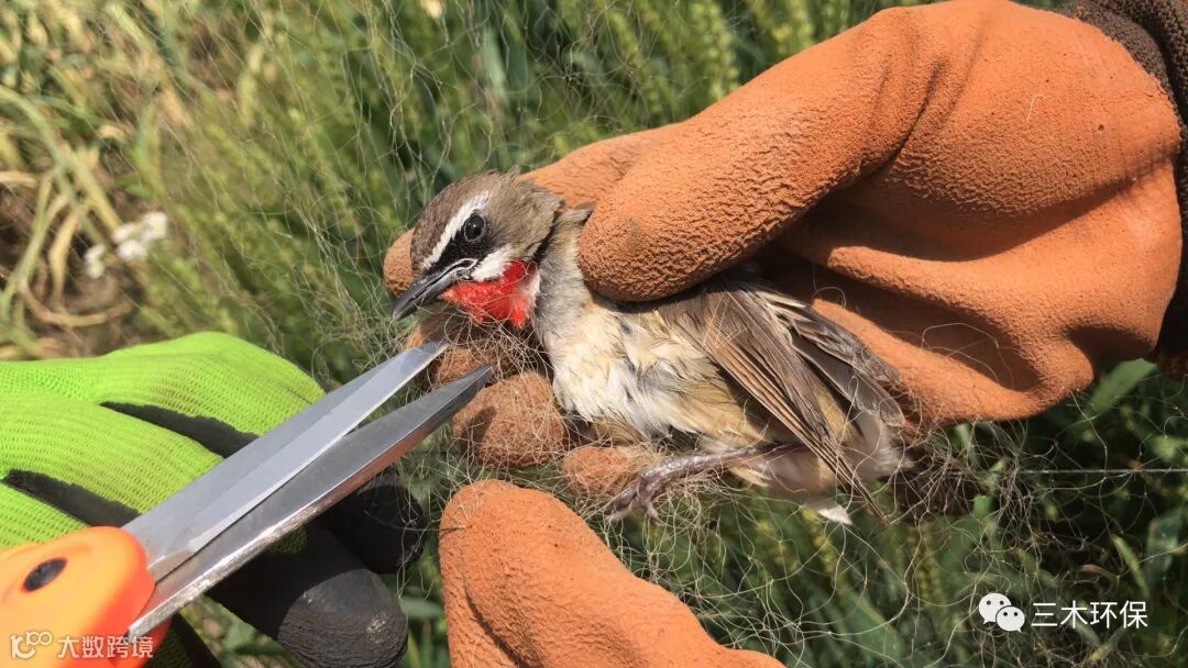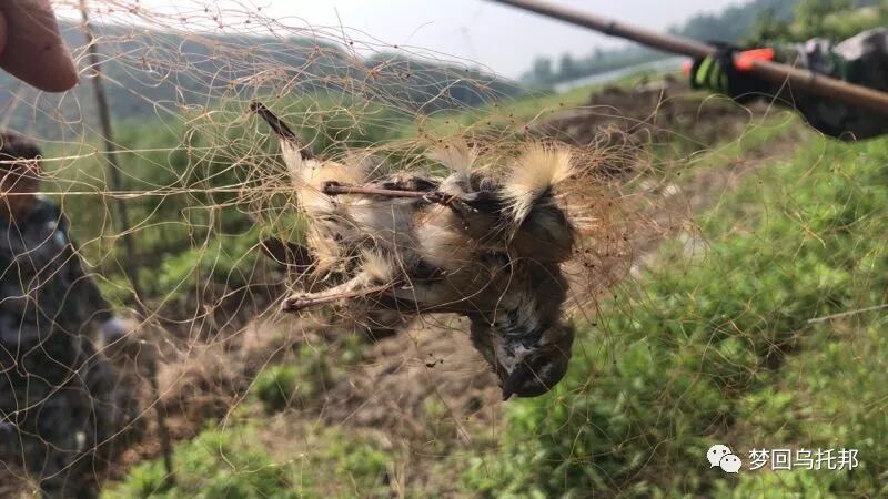 在海宁尖山附近拆除捕鸟网82张,解救活鸟十只(蓝歌鸲、黄眉鹀、红喉歌鸲、白眉鹀、夜鹰、珠颈斑鸠、白眉鸫等)1只活蝴蝶,近四十只鸟死亡,发现一个专门捕鸟点,和尖山派出所,村干部,护林员一起拆除捕鸟网,还有很多。5月3日上午收到救鸟志愿者消息,夜鹰已经放飞,白眉鸫因伤势过重,已经死亡。