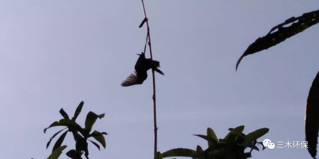 12点左右,由于部分志愿者下午有事,我们平湖的四位志愿者和嘉兴、海盐过来的志愿者一起继续前往尖山杨梅农庄所在山。映入眼帘的是一只被捆在树上的夜鹰。