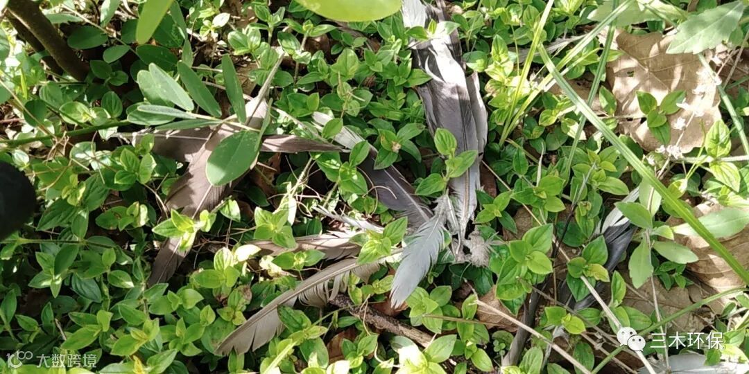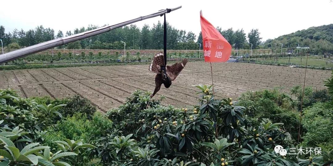 中午,烈日炎炎,大伙儿忙热气腾腾,饥肠辘辘之下各自啃了自带干粮,然后兵分几路继续巡护。在小尖山果园,我们一小队又发现几处捕鸟网竹竿,原来是以为单纯保护果树,走进仔细一看,其中另有玄机,三张高4,5米,长20来米大型捕鸟网上都是鸟类残羽,却不见鸟类尸体,在附近地上,我们发现一堆鸟类羽毛,是一个杀鸟现场,原来是捕鸟人借着保护果树名义,趁机捕鸟。我们拆除三张捕鸟网后又发现不远处居然有一只野鸟被绳子捆住脚倒吊在竹竿上,走近一看是一只夜鹰,夜鹰身后就是两张捕鸟网。我们怀疑是捕鸟人利用这只夜鹰叫声吸引其同类来自投罗网,我们马上救下这只夜鹰,联系另外一组志愿者后分开在四周巡护,忽然一位中老年男子拿着家伙凶神恶煞来到我们最小95后志愿者前,我们听到声音,前去询问这果园是否是他的,五张捕鸟网是否其所架,夜鹰是否是他所抓,这位中老年男子骂骂咧咧,既不承认也不否认,另外一组志愿者也上来,我们7,8人,嘉兴志愿者报警,这位男子看见我们报警,灰溜溜走了,我想抓住他,被劝阻。