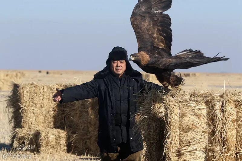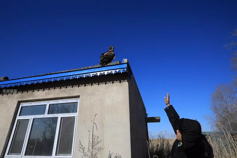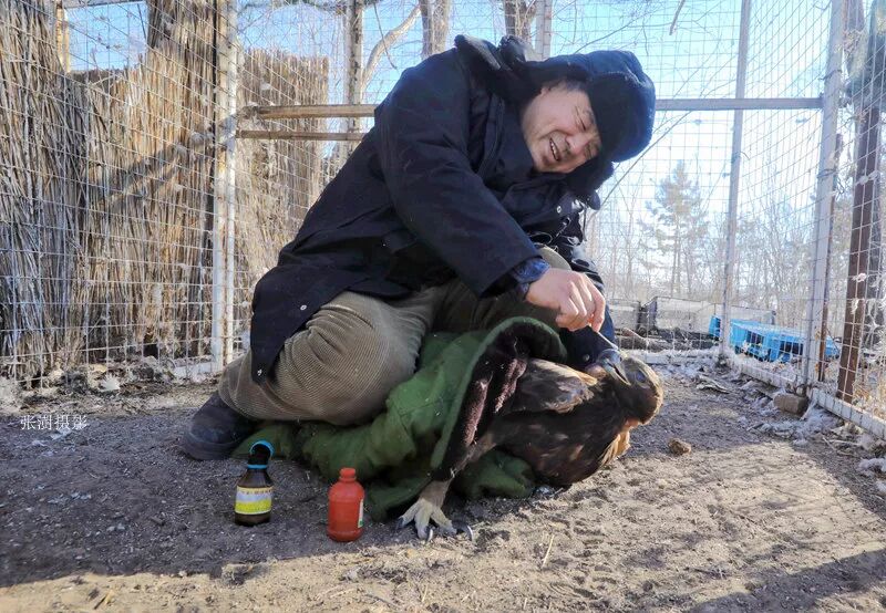 黑龙江省大庆市, 扎龙自然保护区林甸湿地的松鹤岛上,让候鸟飞伙伴团队大庆市林甸县野生动物保护协会秘书长付建国在进行护鸟工作。他正在为救护多年的一只金雕进行野放训练。