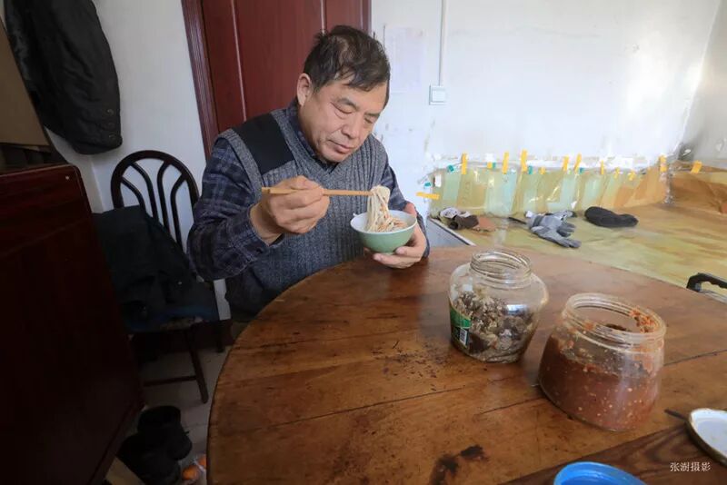 住在岛上,付建国腌了近十样咸菜。经常过了饭点才吃饭的他,为了省事,常是煮一匝挂面,就着辣椒酱等咸菜对付一口。