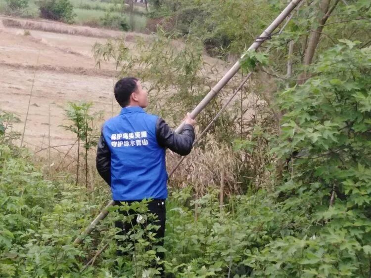 2、4月23日,志愿者在乐平市接渡镇传贤塘(S307)省道,拆除1张长约40米,宽约4米的巨型非法捕鸟网,现场解救沙锥3只。