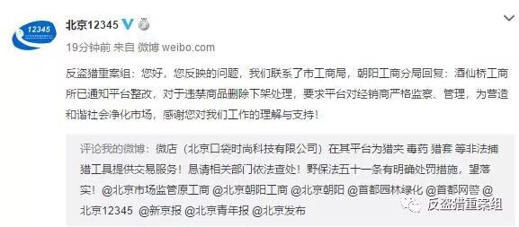 3、通过微博和微信公众号公开举报的微店售卖毒鸟药等非法捕猎工具问题,4月15日得到北京12345官方微博微博回复:“酒仙桥工商所已通知平台整改,对于违禁商品删除下架处理,并要求平台对经销商严格监察、管理!”