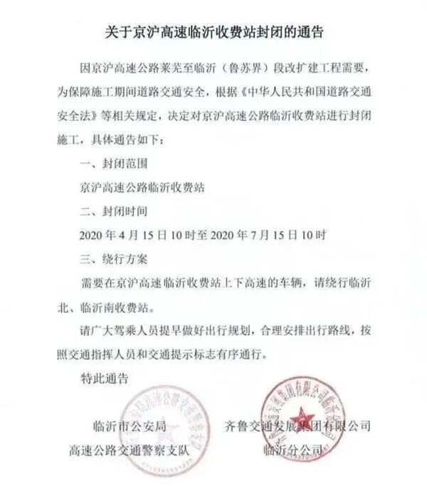因京沪高速公路莱芜至临沂(鲁苏界)段改扩建工程需要,为保障施工期间道路交通安全,根据《中华人民共和国道路交通安全法》等相关规定,决定对京沪高速公路临沂收费站进行封闭施工,具体通告如下: