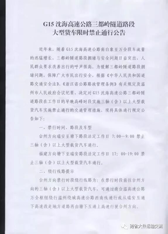 导读:因G15沈海高速三都岭隧道路段车流量大,现在开始限时货车禁行通告,通行时间以及绕路方案详情见图