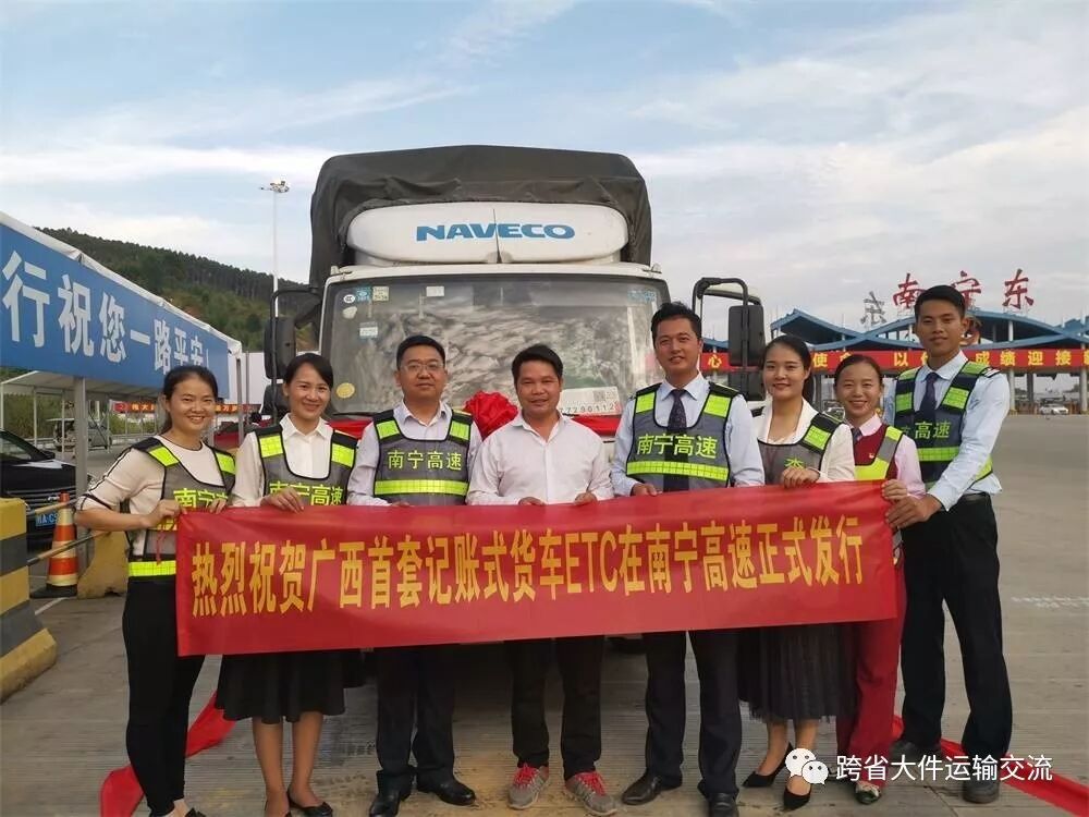 11月1日,在南宁东收费站,货车车主郑先生领到了广西区内第一套货车车载电子标签和ETC记账卡套装,并完成车载电子标签激活,开启了高速公路不停车交费通行的新旅程。