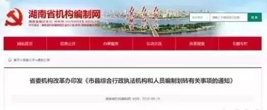 8月13日,湖南省发布了《关于市县综合行政执法改革机构和人员编制划转有关事项的通知》。