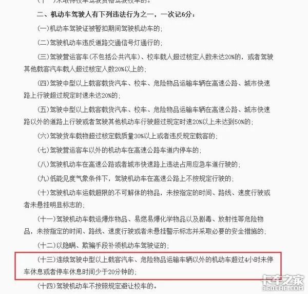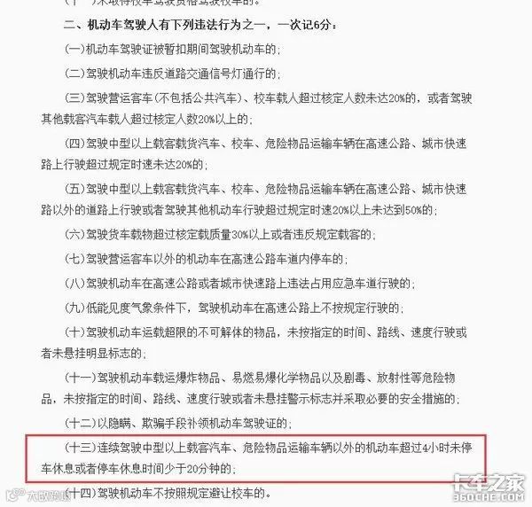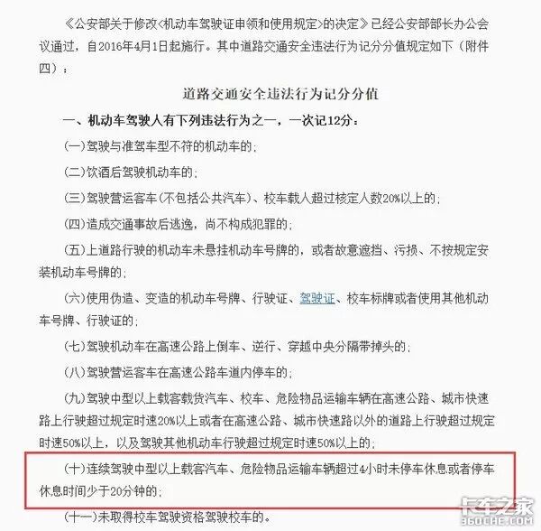 这么严?看看法律怎么规定的!《机动车驾驶证申领和使用规定》:连续驾驶中型以上载客汽车、危险物品运输车辆超过4小时未停车休息或者停车休息时间少于20分钟的,一次扣12分;连续驾驶中型以上载客汽车、危险物品运输车辆以外的其他机动车超过4小时未停车休息或者停车休息时间少于20分钟的,一次扣6分。