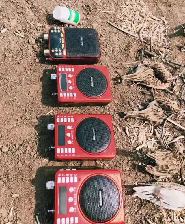 志愿者介绍,迁徙的云雀在听到诱鸟机播放出来的鸟鸣声后,以为是同伴在呼叫它,很快被吸引过来,不法分子在附近地面上设下捕鸟夹,每个捕鸟夹上面有一只面包虫,迁徙的候鸟看到虫子后飞去捕食,结果就会触动捕鸟夹上的机关装置,夹子会迅速闭合,鸟儿通常会被夹身亡。图为现场留下的诱鸟机 。