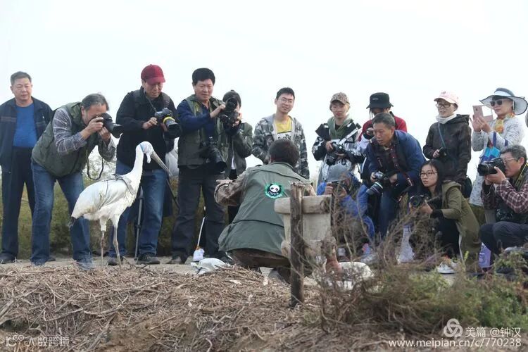 我们看到,小白鹳已经长的和它们的爸爸妈妈一样大了,精神很好,当解开束缚的外套和眼罩放开后,它们并不着急走开,而是活动活动腿脚,扑扇几下翅膀。当人们目送它们走出很远了才起飞,随即又落下,在水边活动,依依不舍离开的样子。