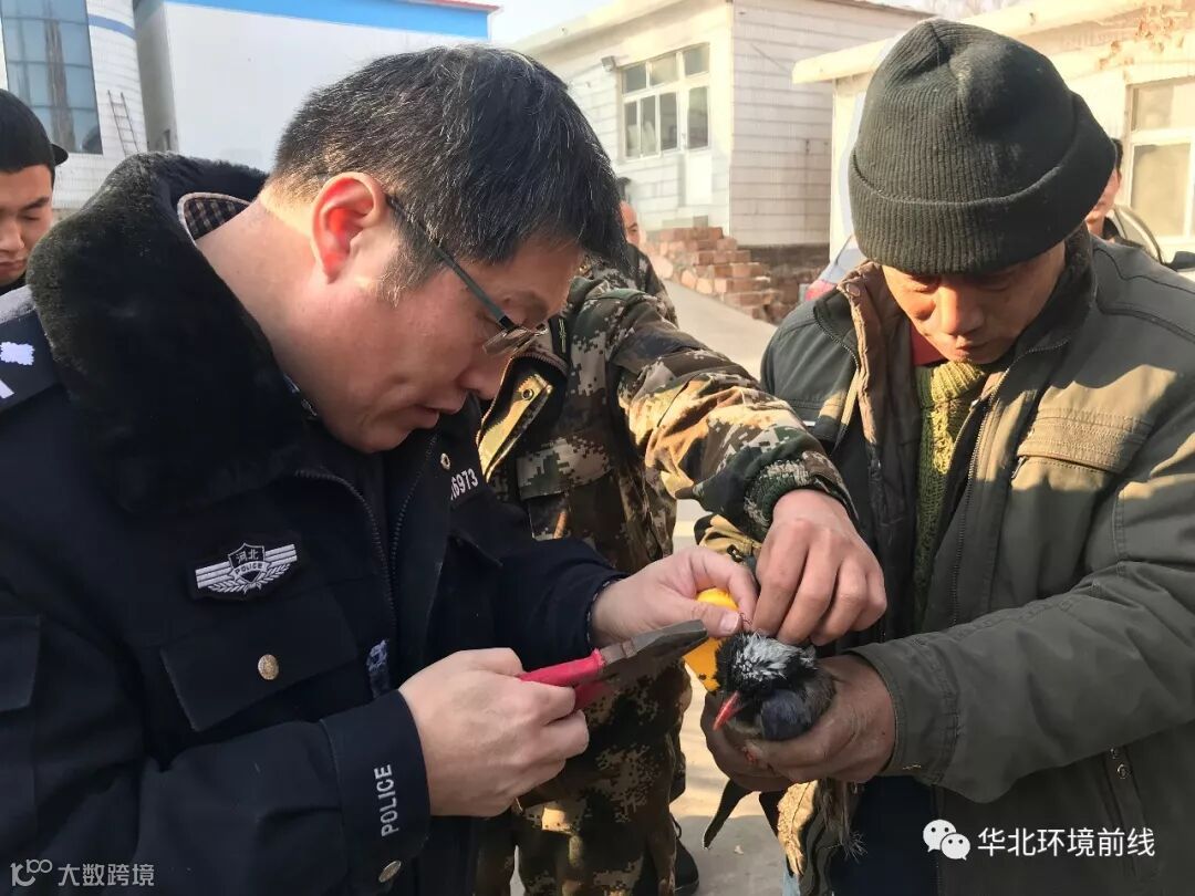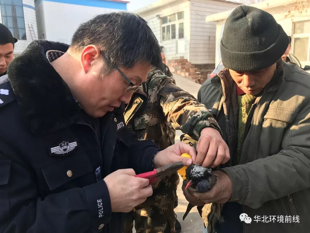 12月29日,华北环境前线志愿者邢世杰到南高营镇前进村巡护,在村北发现鸟网。据了解,架网的老人已经82岁,去年被森林警察抓过,老人说自己有癌症,还让警察看诊断证明,说再也不干了。这次又发现他在现场非法捕猎野生鸟类。现场从老人的手中解救斑鸠1只,麻雀3只,拆除非法捕猎网6张。