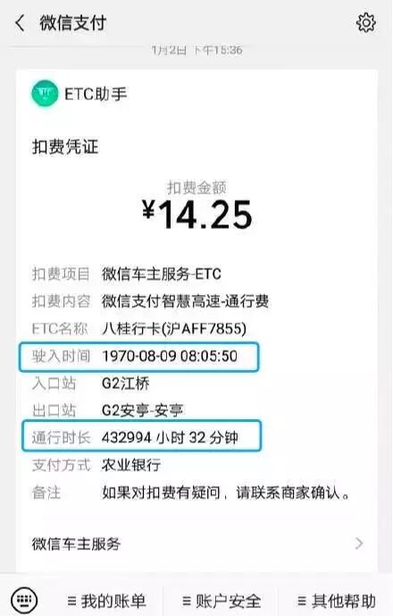根据网友提供的消息,有车主的ETC扣费显示,其驶入高速的时间为1970年8月9日,通行时长达43.3万小时!