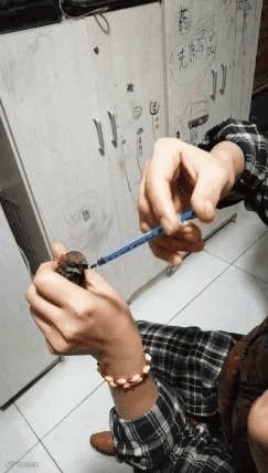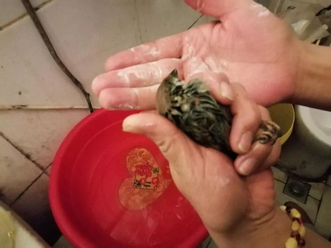 她将食用油抹在麻雀身上有胶水的地方,然后再撒上面粉,然后轻轻的揉。揉的力度一定要把握好,不能揉掉羽毛。