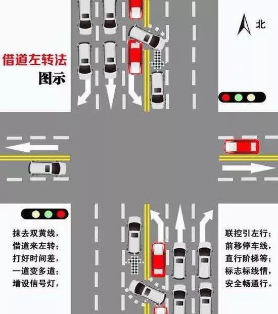 有“借到左转”车道的路口,一般会在距离路口停止线60米左右设置“借到左转”信号灯,有的是在道路中间,有的在上方指示牌里,当信号灯变成绿色的时候,大家可以驶入左转待转车道,等待大路口绿灯亮起后,再依次通过路口即可!