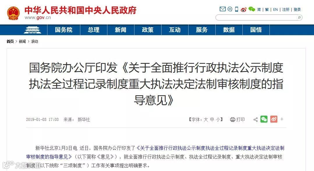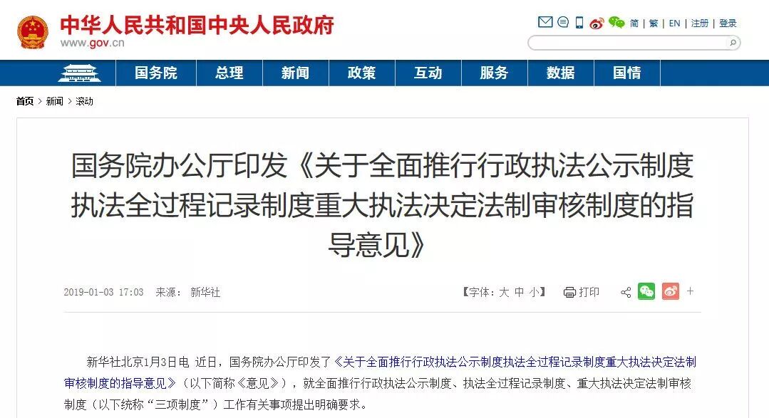 1月3日,国务院办公厅印发了通知,全面推行行政执法公示制度、执法全过程记录制度、重大执法决定法制审核制度(以下统称“三项制度”)。