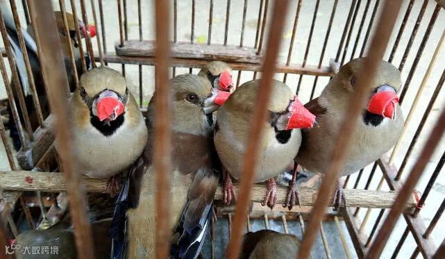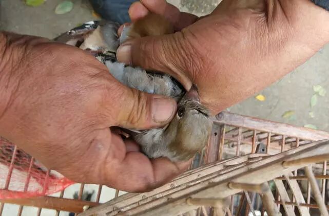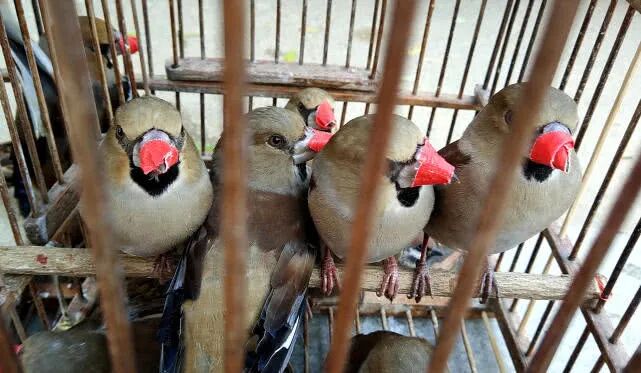 在现场,数十只野生鸟被装到一个狭小的笼子内,一些野鸟由于性子野,不愿屈服,猛劲地用坚硬的喙啄困住它的笼子,以至于头破血流。有的鸟贩担心被啄,将鸟嘴用胶带缠上,致使鸟儿无法正常进水进食。