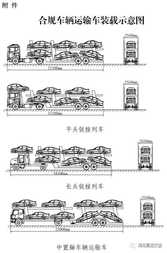 ▲对合规车辆运输车,凡装载符合要求的,即:平头铰接列车装载6辆及以下,长头铰接列车装载7辆及以下,中置轴车辆运输车装载8辆及以下,且装载长度、宽度未超过车辆运输车外廓尺寸限值的(见附件),暂不对超高进行处罚。装载数量超过上述数值的,区分以下情况处理: