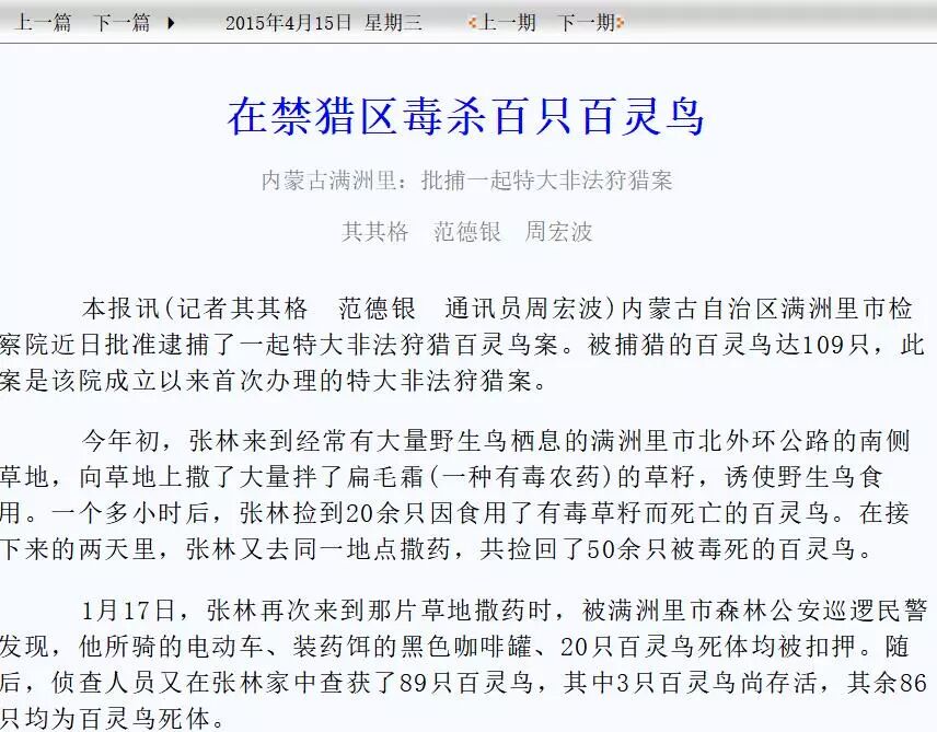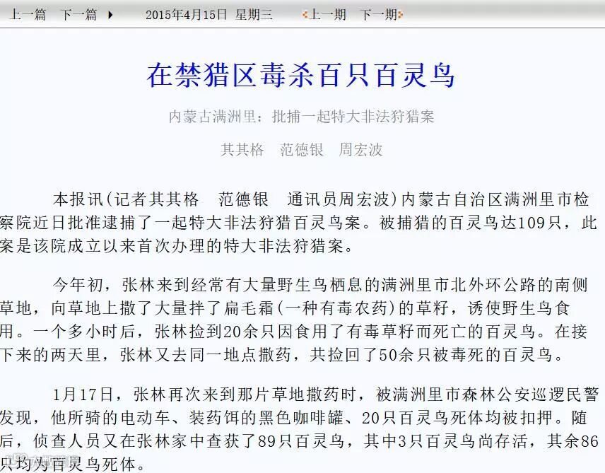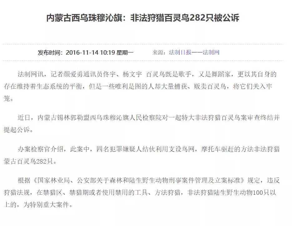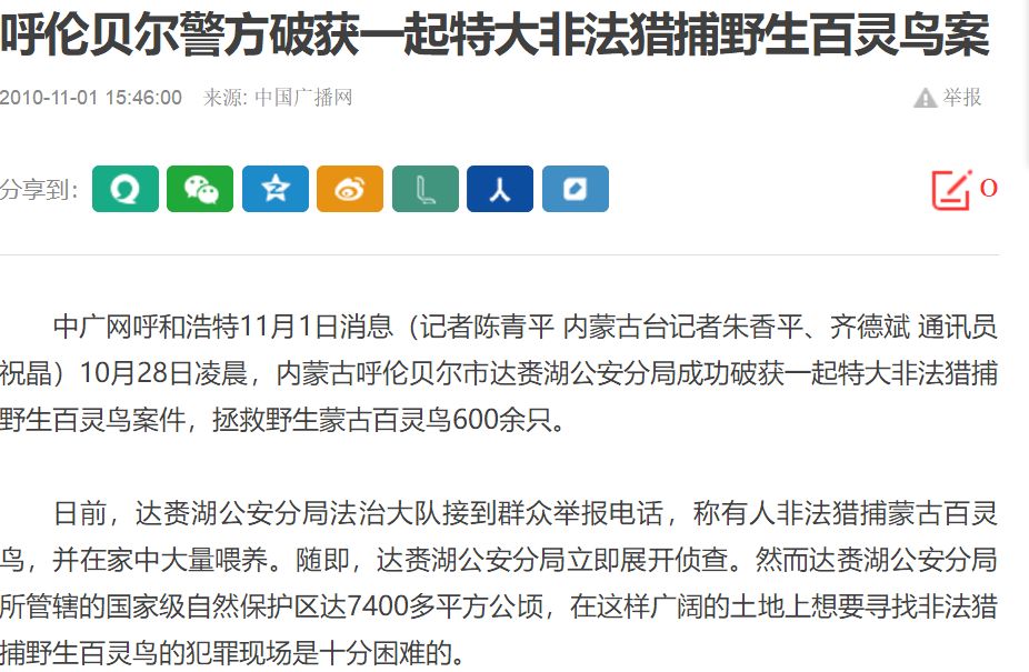 志愿者在网上搜索关键字“百灵鸟 案”则会搜索出很多关于百灵鸟被偷猎的案件,而且似乎屡禁不止。(如下截图,仅部分)