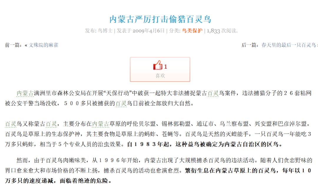 我们是热爱大自然,自发保护野生动物保护的志愿者,因了解到现在在百灵鸟繁殖季大量黑手伸向草原捕捉百灵鸟雏鸟,故写信给您。