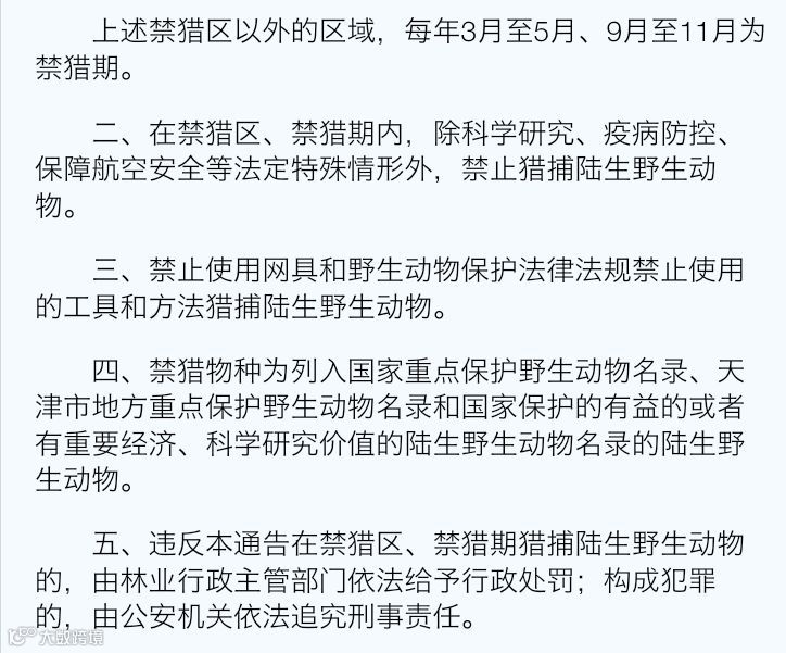 新闻报道后不久,天津市划定了禁猎区、禁猎期,规定每年3月至5月、9月至11月为禁猎期,期间“除科学研究、疫病防控、保障航空安全等法定特殊情形外,禁止猎捕陆生野生动物”。且即使在持有狩猎证、允许捕猎的时期地点,也“禁止使用网具和野生动物保护法律法规禁止使用的工具和方法猎捕陆生野生动物”。