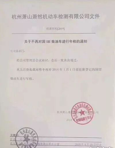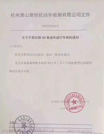 近日爆料称:杭州萧山萧然机动车检测有限公司发布一个文件,称不再对国三柴油车进行年检。