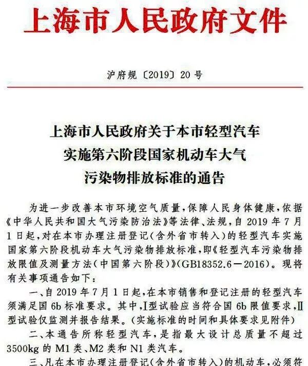 日前,上海市人民政府发布通告,指出将在2019年7月1日正式提前实施国六b排放标准,实施对象为最大设计总质量不超过3500kg的M1类、M2类和N1类(包括微卡、小卡)汽车。