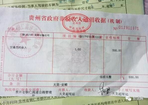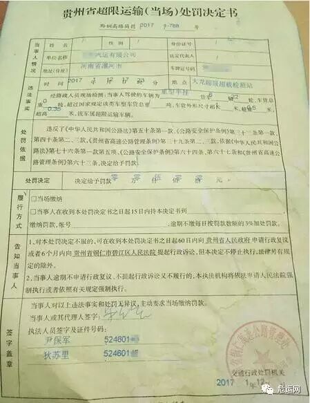 在9.21以后,各地都在治理超限超载的车辆,近日,一位卡友给我发来一张罚单,内容是关于自己的车子在贵州某超限站被罚款的情况。根据卡友介绍,自己的车是因为超高被罚,而且罚款是根据超高的高度来定的。
