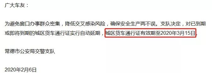 为避免窗口办事群众密集,降低交叉感染风险,确保安全生产两不误。常德市公安局交警支队对已到期或即将到期的城区货车通行证实行自动延期,城区货车通行证有效期至2020年3月15日。