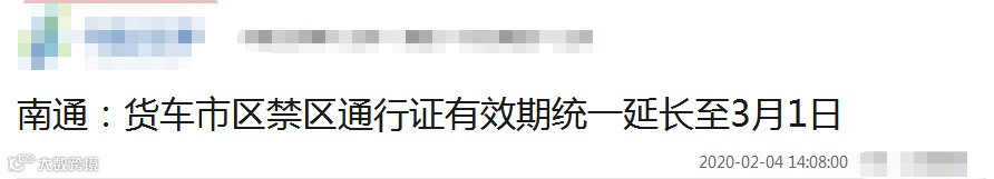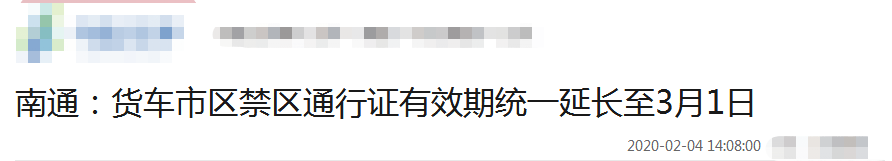 根据疫情防控需要,为减少交通出行和人员聚集,针对货运车辆市区禁区通行证到期换证问题,南通市公安局交警支队已通过系统后台,将在此期间到期的所有禁区通行证有效期统一延长至3月1日。