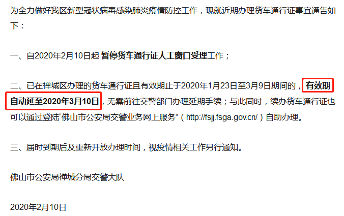 为全力做好我区新型冠状病毒感染肺炎疫情防控工作,2月10日,佛山市公安局禅城分局交警大队就近期办理货车通行证事宜发出通知。