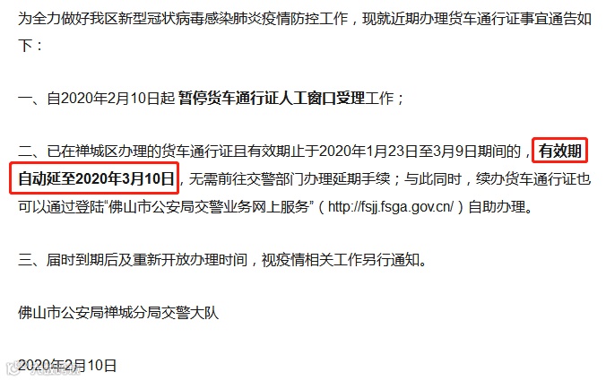 2、已在禅城区办理的货车通行证且有效期止于2020年1月23日至3月9日期间的, 有效期自动延至2020年3月10日,无需前往交警部门办理延期手续;与此同时,续办货车通行证也可以通过登陆“佛山市公安局交警业务网上服务”(http://fsjj.fsga.gov.cn/)自助办理。