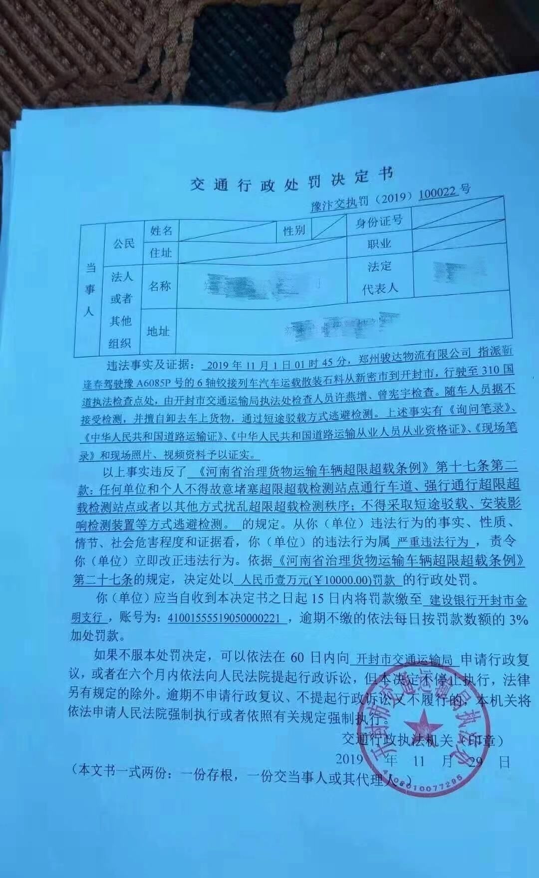 11月1日没有在开封却被罚了10000元?对此交通局的工作人员表示:那我就不清楚了……