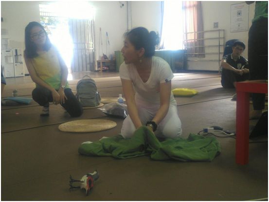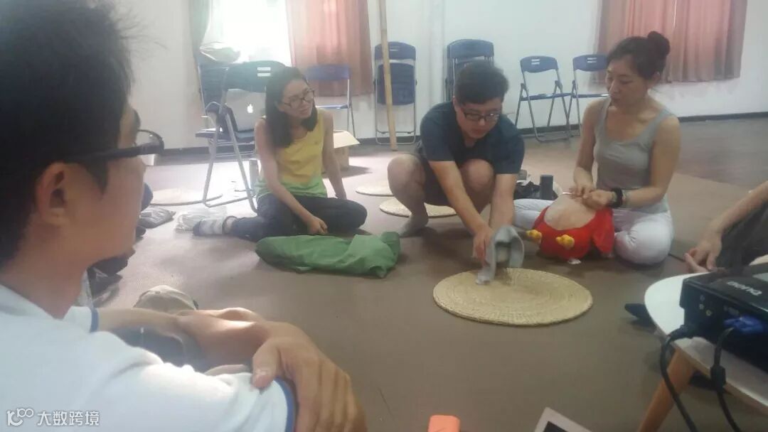 活动的下半场,大家席地而坐,轮流练习刚刚学习到的救助手法,然后邀请同伴互作点评,相互检验所学是否记住,最终由张苗再做评估确认,形成相对深刻的印象。