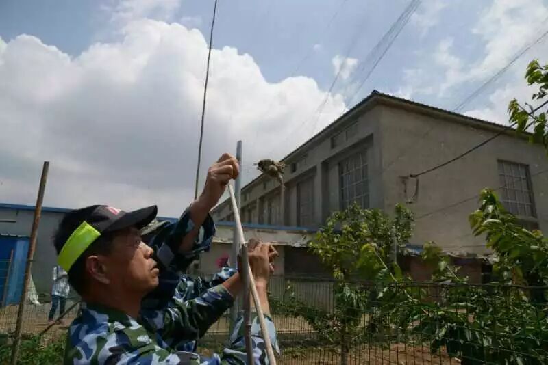 网上还挂着一只活着的麻雀,志愿者帅哥大哥正在小心的取鸟