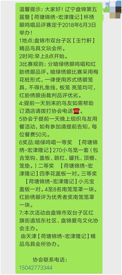 近日,护鸟志愿者了解到一个名为“盘锦市双台子区红旗街道旭东社区、盘锦爱鸟文化协会”的组织将于2018年6月3日星期日早8点在盘锦市双台子区玉竹轩精品鸟具文玩会所举办“绣眼鸣唱品评赛”,比赛中设立一、二、三等奖项以赢取相应奖品来吸引全国各地人员参加。