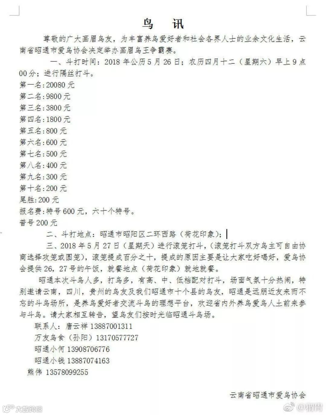 志愿者接到市民报料,一个名为“云南省昭通市爱鸟协会”的组织将于5月26日在昭通市昭阳区二环西路荷花印象举办“画眉鸟王争霸赛”,以总额为38480元的奖金为引诱,向参加画眉斗鸟的人员收取特号600元,普号200元的报名费用。