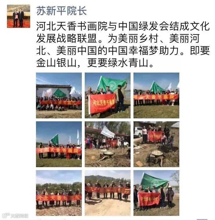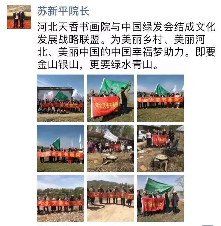4月15日,河北省天香书画院著名书画家苏新平院长带领10余名知名画家和让候鸟飞华北环境前线24名志愿者一起巡河护鸟。苏新平院长与华北环境前线执行主任高琼结成绿色文化发展战略联盟,为美丽乡村、美丽河北、美丽幸福的中国梦助力!我们既要金山银山,更要绿水青山!