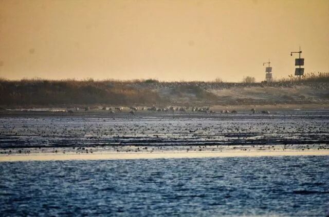 然鹅,还没有结束,2个小时后,在距养殖池6公里外的一处海岛旁的潮间带滩涂上,我们又发现了约70只灰鹤(照片未能全部囊括这个灰鹤群体)