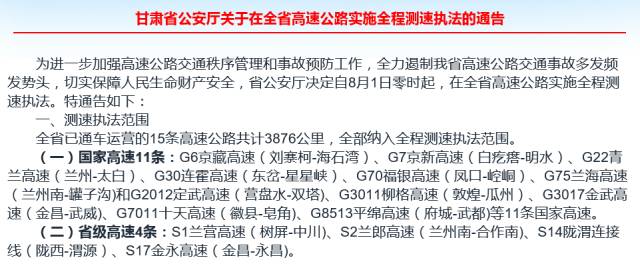 甘肃省公安厅决定自8月1日零时起,全省已通车运营的15条高速公路共计3876公里,全部纳入全程测速执法范围。特通告如下: