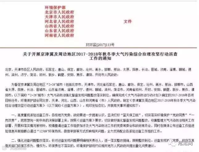 此次巡查环保部在通知中强调,2017 年上半年京津冀地区 PM2.5平均浓度不降反升,同比上升了 14.3%,形势非常严峻。