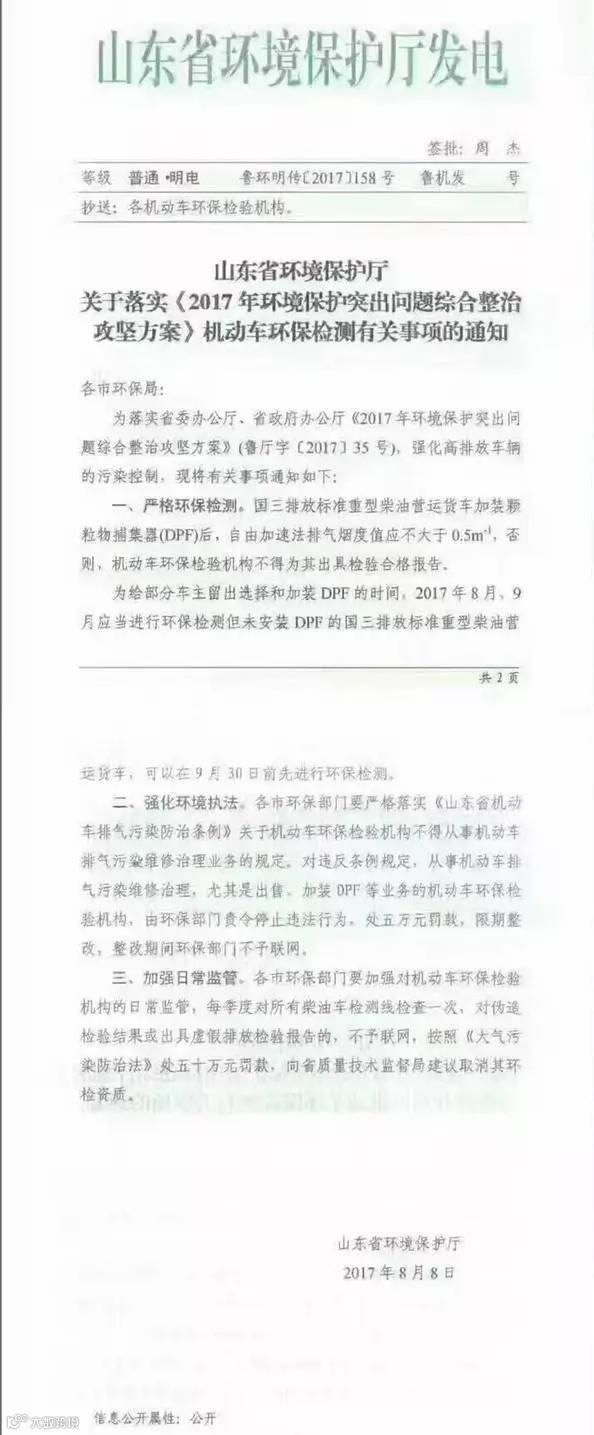 随后山东省环境保护厅发布通知,2017年8月9月,国三车重型柴油营运车可正常进行环保检测。