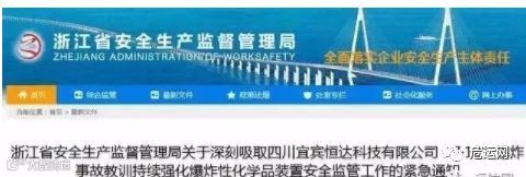 7月14日,浙江省安全生产监督管理局发布:关于深刻汲取四川宜宾恒达科技有限公司“7·12”爆炸事故教训持续强化爆炸性化学品装置安全监管工作的紧急通知。