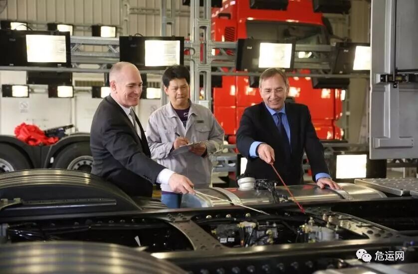 【福田戴姆勒汽车卡车制造与物流副总裁郝汉龙、质量副总裁施威尔在评审车间检查首台欧曼EST超级卡车】