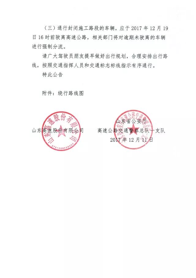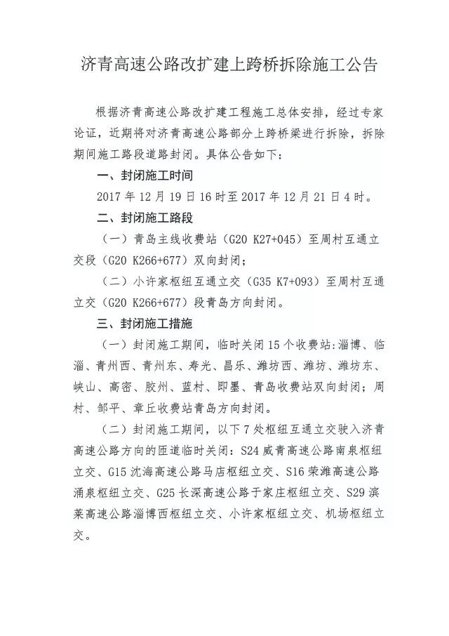 根据济青高速公路改扩建工程施工总体安排,2017年12月19日16时至2017年12月21日4时,将对济青高速公路部分上跨桥梁进行拆除,拆除期间施工路段道路封闭。