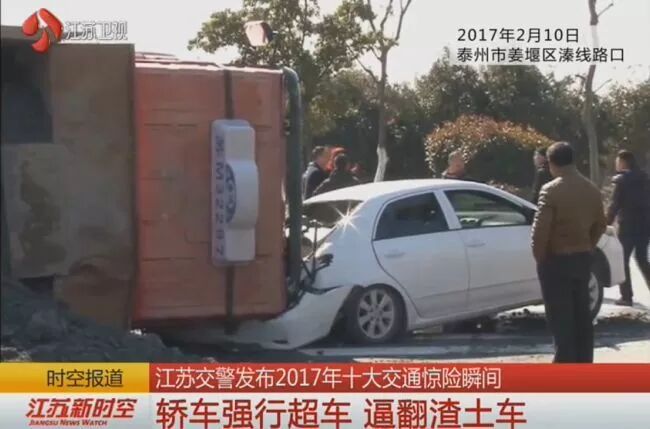 2017年2月10日,江苏泰州市姜堰区溱线路口,强行超车的轿车将正常行驶的渣土车逼翻在地,幸好渣土车只砸中了轿车的后备箱,并未造成伤亡。交警提醒,变道超车时,一定不能影响其他车辆的正常行驶,切记先观察、再打灯变道。