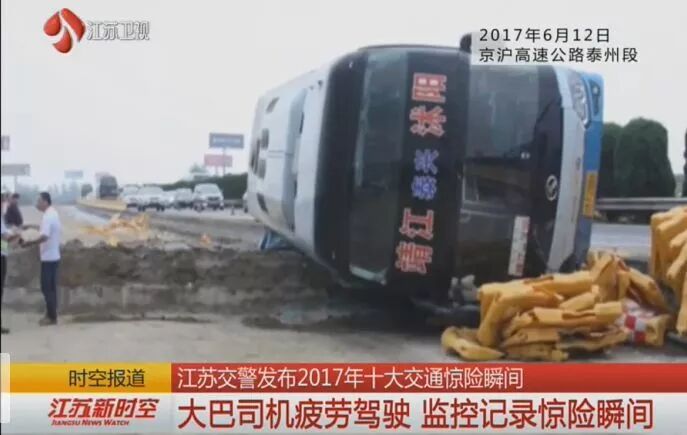 2017年6月12日,京沪高速公路江苏泰州段,大客车驾驶人疲劳驾驶导致车辆侧翻,所幸车上只有个别乘客轻微擦伤。专业驾驶员要为所有乘客的安全负责,上路前应当保持充足睡眠,连续行车期间多停留休息。