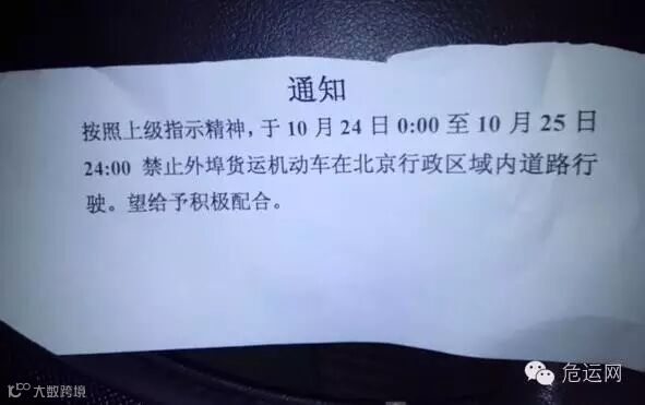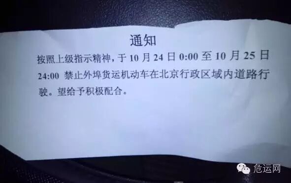 根据北京市公安局公安交通管理局紧急通知,自10月24日零时至10月25日24时,北京市行政区域内禁止外阜货运机动车通行。