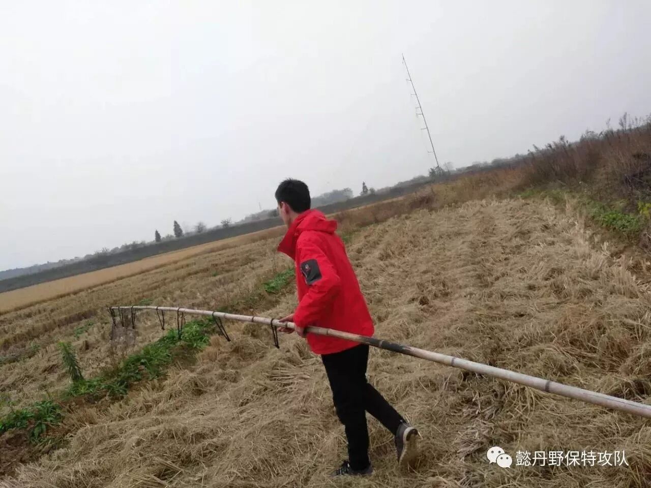 11月22日,志愿者在嬉子湖镇的田野池塘徒步近4公里,拆除鸟网14张,救助斑鸠两只。