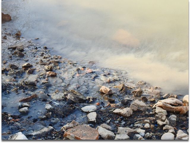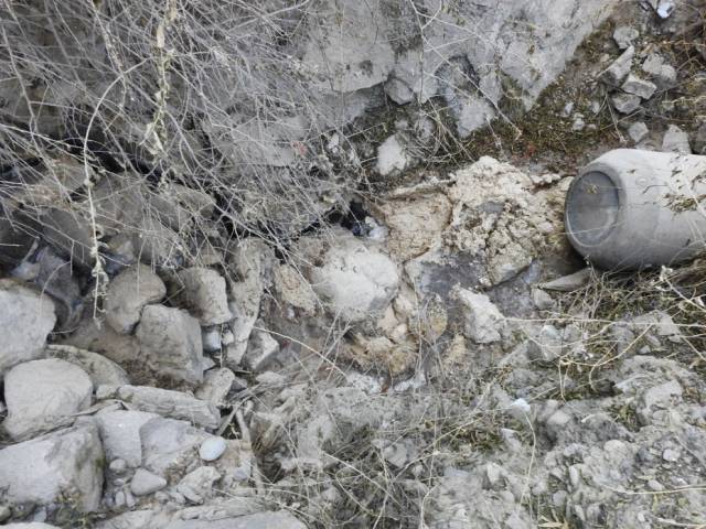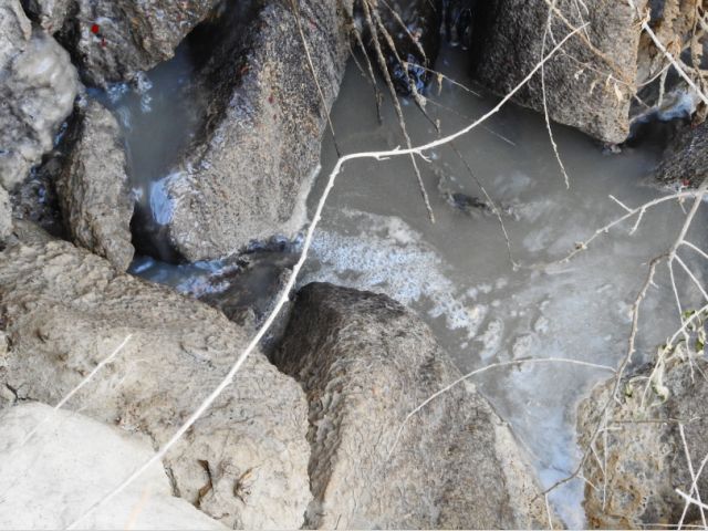 志愿者发现有一些污水已经板结,说明浓度很高,这些板结的泡沫状物体不断散发着阵阵恶臭,现在是冬天,不知夏天这里是怎样的恶臭熏天?